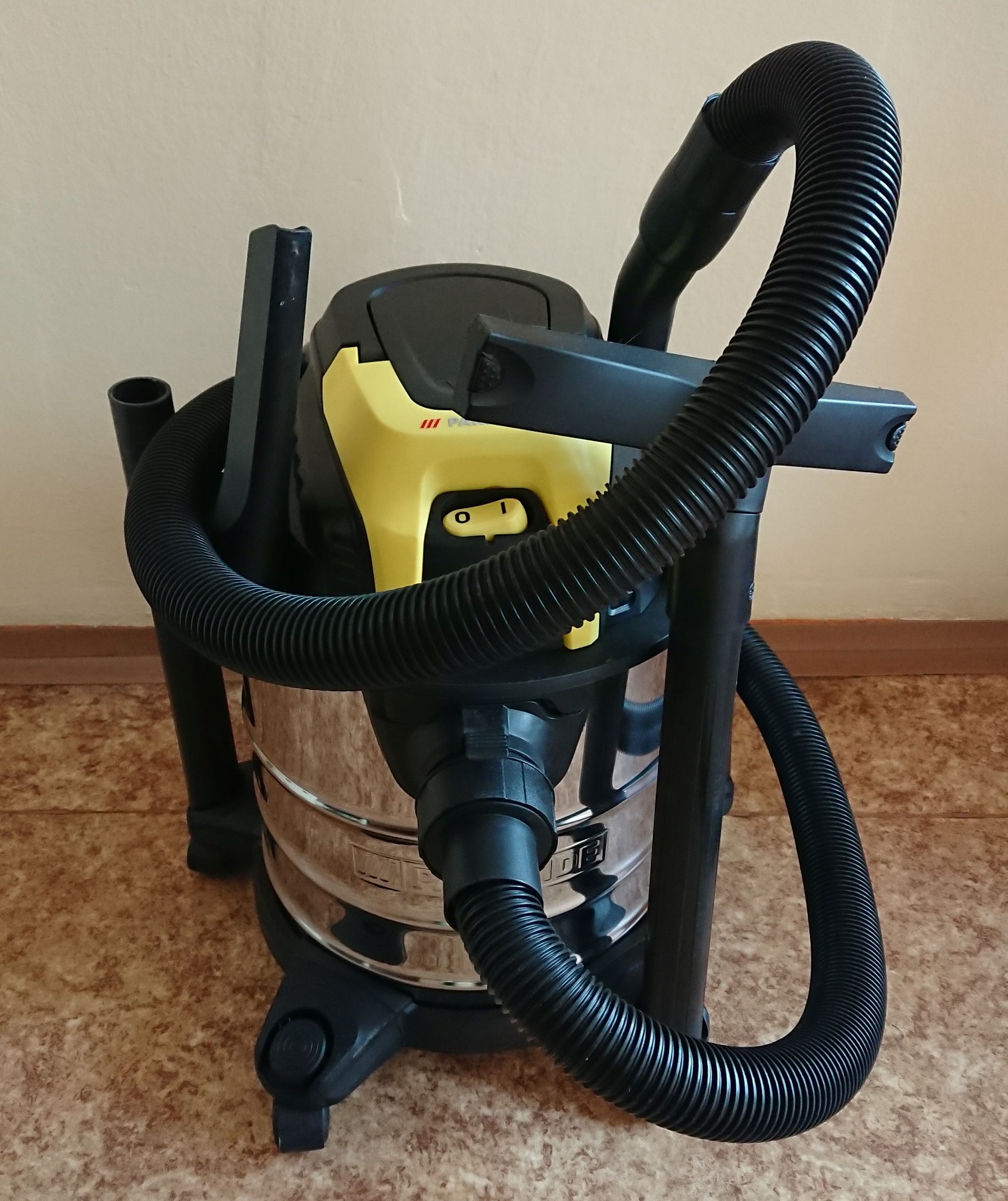 Multifunkční vysavač, který odstraňuje mokrou i suchou špínu. Snadné vyprázdnění nádoby z nerezové oceli, 5 koleček pro větší stabilitu.